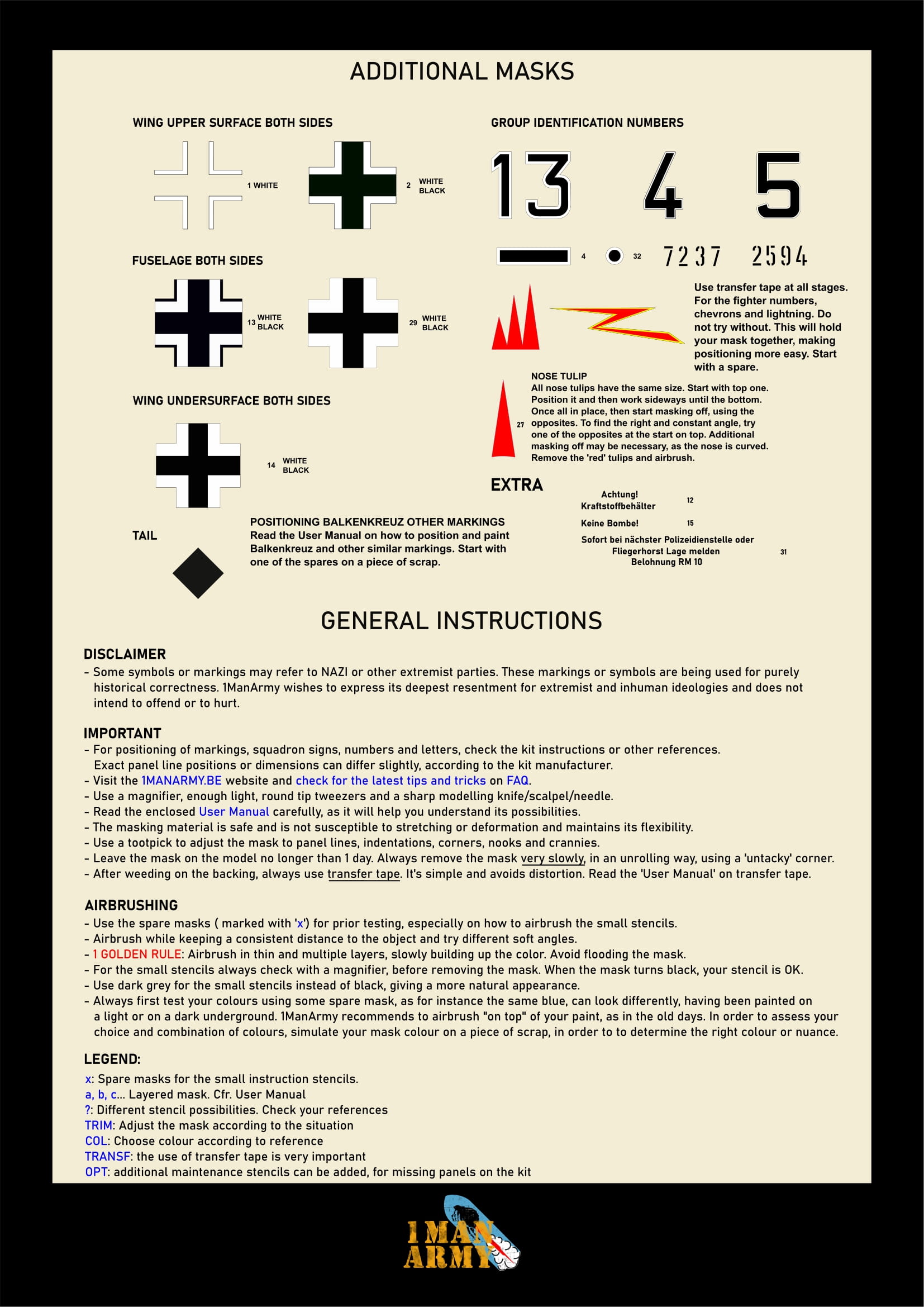 1ManArmy - 1/32 Focke-Wulf Fw-190A-5 high definition stencilling and national insignia paint masks for Hobby Boss