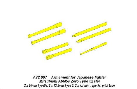 Aber - 1/72 Armament for Japanese fighter Mitsubishi A6M5c Zero for Airfix, Hasegawa and Heller Fits to Mitsubishi A6M5c Zero Type 52 Hei; contain: 2 x 20mm Type99; 2 x 13,2mm Type 3; 2 x 7,7 mm Type 97; pitot tube