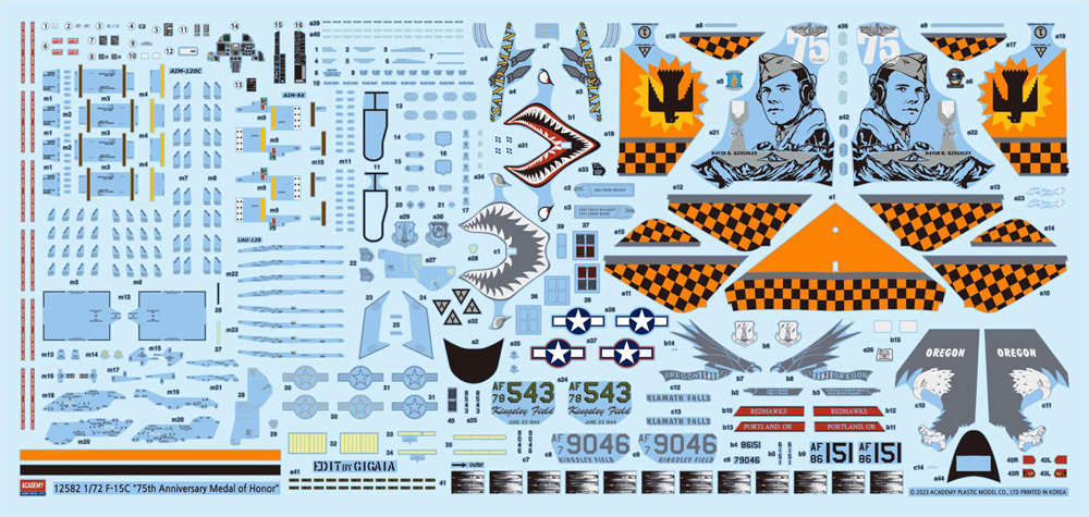 Special 75th anniversary markings in remembrance of 2nd Lt David R. Kingsley of the United States Army Air Forces, killed in action on 23rd June 1944 when his B-17 Flying Fortress 'Sandman' was brought down during a bombing mission over the oil refineries of Ploesti, Romania. 2nd Lt Kingsley was awarded the Congressional Medal of Honor for his gallantry. Kingsley Field in Oregon where the F-15C is based is named after him.