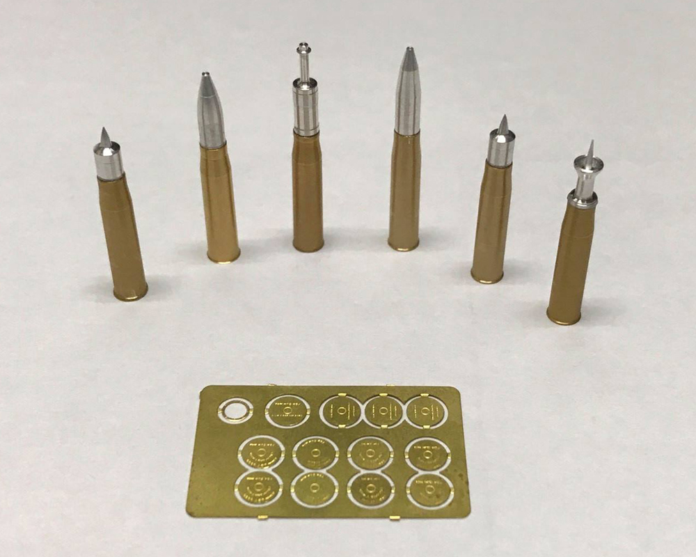 12 brass shells of type M392, M416, M456A2, M494, M728, M774 plus photo-etch headstamps.