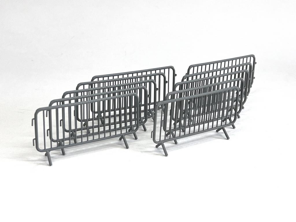 A set of ten 3D-printed barriers, which can be linked together for air show dioramas. Each section is 67.5mm long