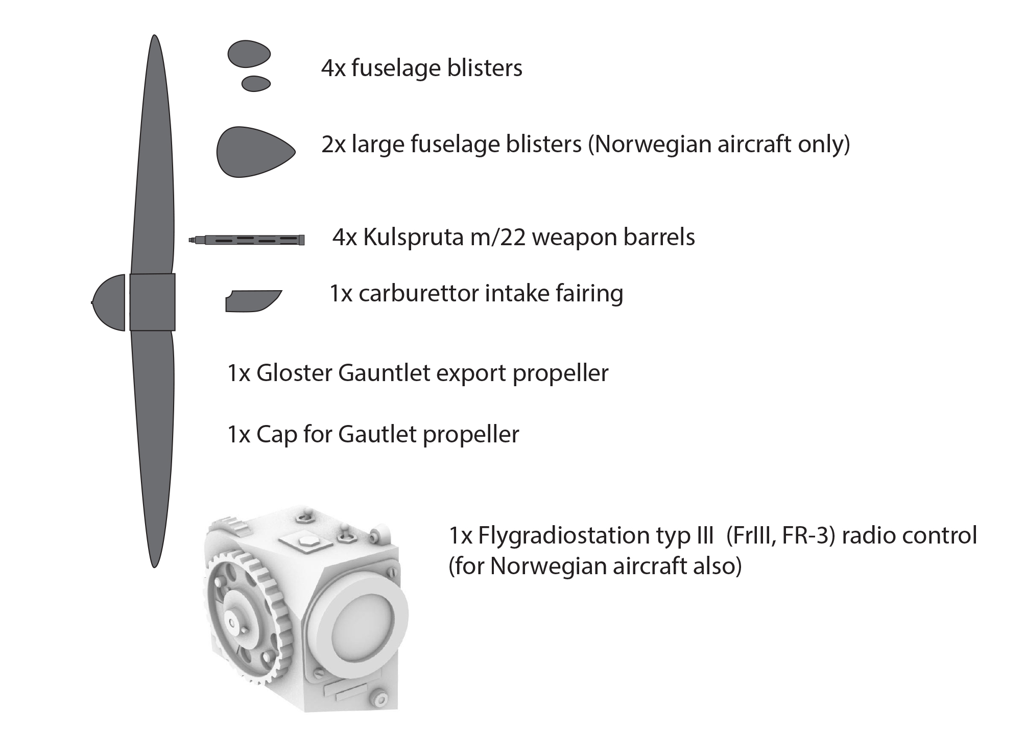 Aims - 1/32 Swedish J8 conversion for the Icm Gloster Gladiator Mk.II for Icm Ua Uk This set is also needed for Norwegian Gladiator Mk.I Parts include4x fuselage blisters2x large fuselage blisters Norwegian aircraft only4x Kulspruta m/22 weapon barrels1x Flygradiostation typ III FrIII, FR-3 radio control for Norwegian aircraft also1x carburettor intake fairing1x Gloster Gauntlet export propeller1x Cap for Gauntlet propeller