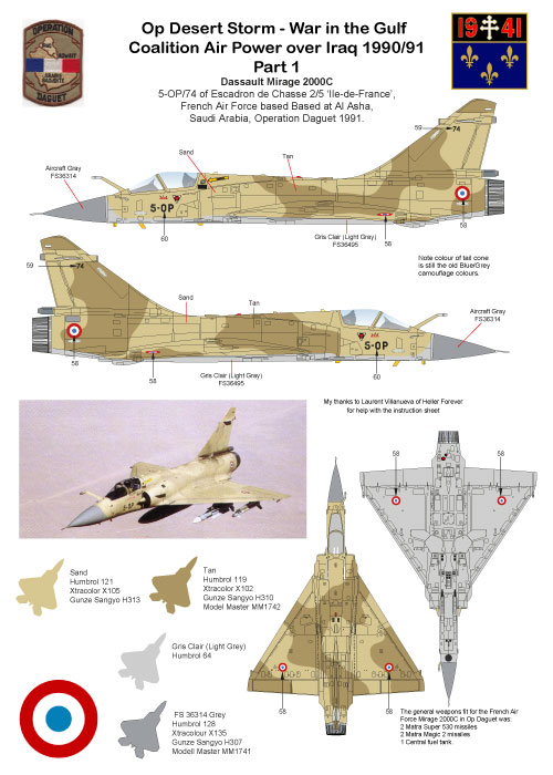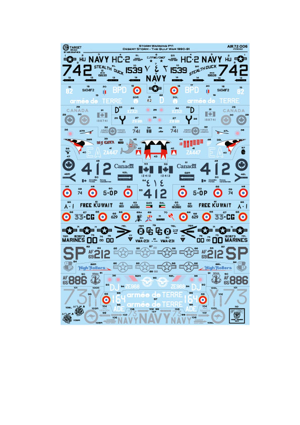 Air-Graphic Models - 1/72 Operation Desert Storm Part 1Westland Gazelle AH.1 XX437 C 4 Regiment AACWestland Gazelle AH.1 ZB691 Y 4 Regiment AACPanavia Tornado GR.1 ZA447/EA Mig Eater, Xv Squadron Raf Based at TabukPanavia Tornado F3, ZE986/DJ, 11 Squadron Raf Based at Dharan Sikorsky S-70B-2 Seahawk, N24-004/73, Situ (HS-816), Ran aboard Hmas SydneyBoeing CF-188A Hornet, 188741, 441 Squadron The Desert Cats, Canadian Armed Forces, (CAF) QatarCH-124A Sea King, 12412, 443 Squadron, CAF, Operation FrictionSH-3G Sea King, 15139/742, HC-2 Desert Duck Airlines, USNMcDD AV-8B Harrier II, 163673/00, VMA-231 Ace of Spades, Usmc Based at Al JubailMcDD F-4G Phantom, 69-7212/SP, 81st TFS/52 Tfw Wild Weasels USAF Based at Sheikh IsaMcDD RF-4C Phantom, 65-0886/, 192 TRS/152 Trg High Rollers, USAF Based at Sheikh IsaDouglas A-4KU Skyhawk, 801 of 9/21 Squadron Free Kuwait Air Force, DhahranDassault Mirage 2000C 5-OP/74 of Escadron de Chasse 2/5 lle-de-France French Air Force Based at Al Asha (Desert Camo Scheme)Dassault Mirage F1CR 33-CG/629 of Escasron de Reconnaissance 1/33 Belfort French Air Force Based at Al Ahsa (Desert Camo Scheme)Aerospatiale SA-330 Puma Ade 164, Escadrille dHlicoptres de Manoeuvre (EHM 6/1) Buffalo 16 Arme de Terre (French Army)Aerospatiale SA-341M Gazelle Bpd 82 of 5e Rgiment dHlicoptres de combat (5e RHC) Arme de Terre (French Army)