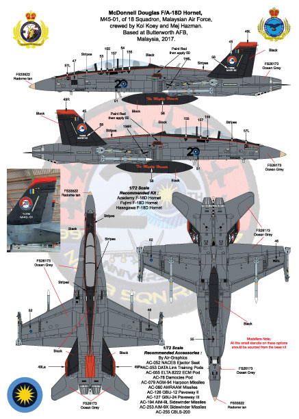 McDonnell-Douglas F/A-18D Hornet, M45-01, of 18 Squadron, Malaysian Air Force, crewed by Kol Koey and Mej Hazman. Based at Butterworth AFB, Malaysia, 2017. (Hornet 20th Anniversary Scheme)
