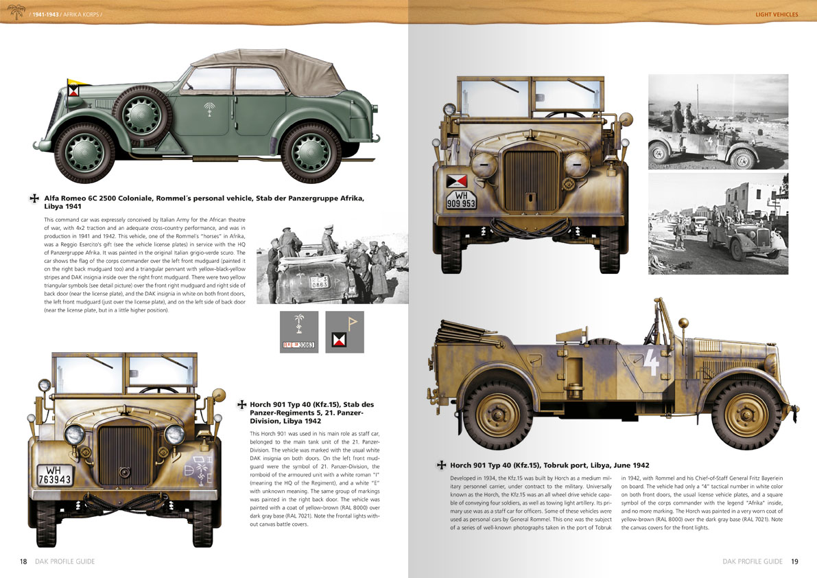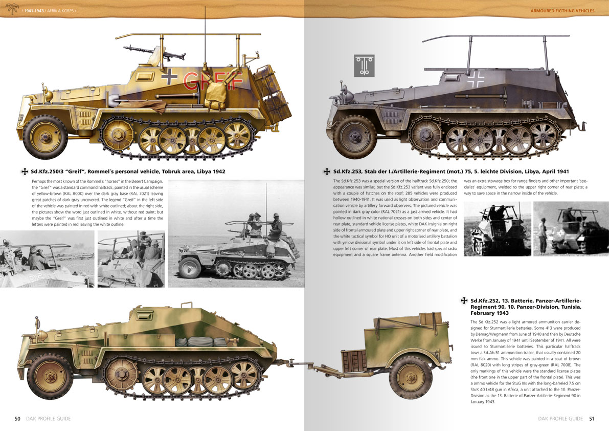 AK Interactive - d.a.k. Profile guide This book shows the original German camouflage of vehicles usedby the Deutsche Afrika Korps, with color variants throughout the war.We look at German Army vehicle colours for the African campaign,including the European Dark Gray (RAL 7021) in which they arrivedto Libya. This continues through to the initial camouflage colours, Yellow-Brown RAL 8000 with Green-Gray spots RAL 7008 (in 1941), andthe Yellow-Brown RAL 8020 and Sand Gray RAL 7027, used from1942. We also include a selection of Italian vehicles, often forgotten,which fought alongside the Germans against the Allies from 1941 to1943. This is supplemented by the addition of allied vehicles servingwith the Axis troops, with some curious American halftracks on a doublepage spread, with distinctive German markings, from 1943. Over170 profiles cover schemes from the most common camouflage to themost original and unusual vehicles used by the DAK and Regio Esercito,including major artillery pieces used in Africa, highlighting aboveall the powerful 88 mm Flak 18/36/37. Through the 108 pages of thisbook, you will fi nd inspiration for ythe next African modelling project,projects that you can enhance further with the AK 550 Africa KorpsColors Acrylic Set, and the AK 068 DAK Weathering Set.