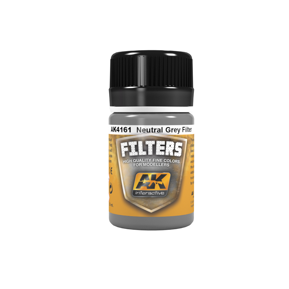 AK-Interactive Neutral Grey Filter, 35ml Neutral grey filter this product allows us to change subtly the tone of the base color of the models and tools making it more accurate and authentic colour. At the same time the filter adds depth and richness to the vehicle, preparing it for the next paint steps. It also can be used in any vehicle.