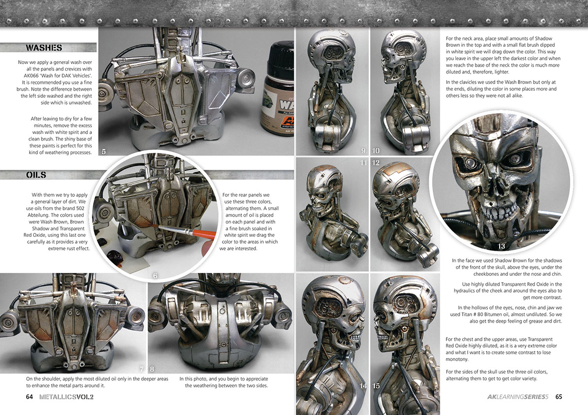 AK Interactive - Metallics vol. 2 learning series 5 metallics have always been a difficult task for modellers. It doesn't matter which modelling branch you choose, at some point you will find yourself in front of a metal piece/part which, of course, you want to finish as realistic as possible. There exist many ways to achieve a metal finish, from the use of enamels, towards waxes and bare metal sheets. Inside these two volumes dedicated to metallics, the talented artists from the ak learning series take you on a journey through the difficult tasks of mastering metallics. In this second volume we will show how to apply metallic effects over historic and fantasy figures. How to paint metallics without metallic paints using the "non metallic metal" technique, to use properly lights and shadows to imitate metallic effects, polished metals, bluing technique etc. Many tricks and techniques from the best modelers. We will see examples applied to robots, spaceships, historic figures, and many more