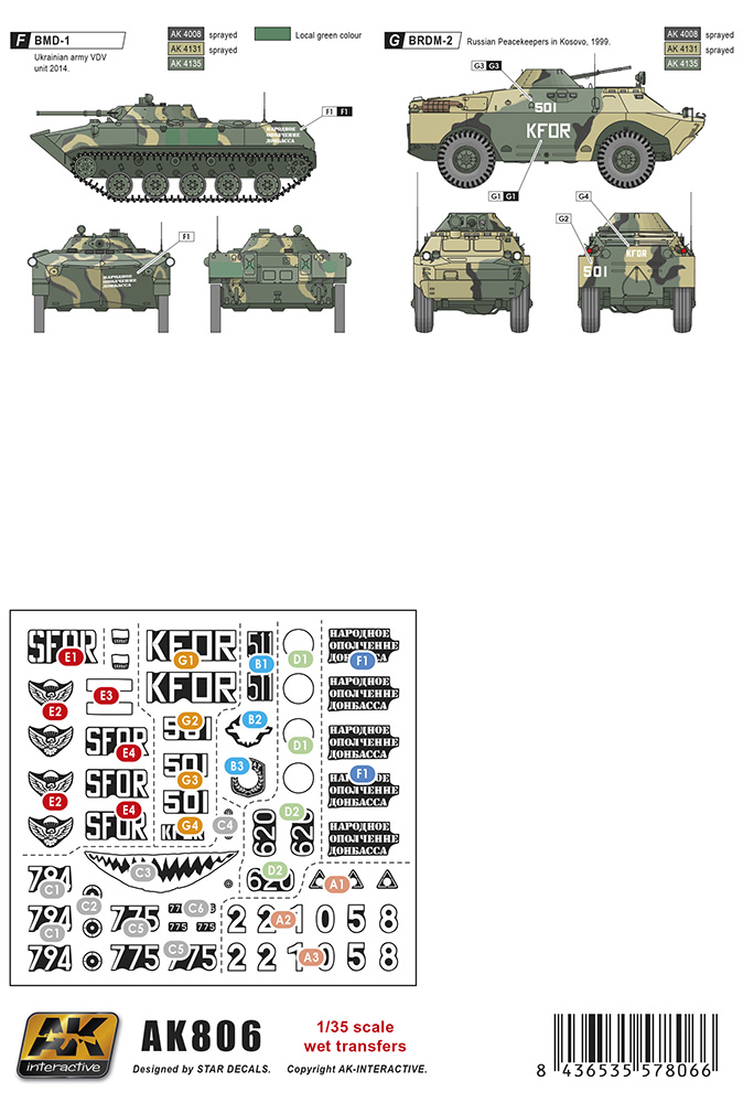 AK Interactive - wet transfer Modern Russian Tanks and AFVs In this set you can find different options for different countries and periods, all related to Russia and the former soviets republics, like Russian peace keeper T-62 in Georgia,BMP-1 in Southern Ossetia, and BRMD-2 in Bosnia, and Ukranian vehicles used in Bosnia crisis and last year 2014 in the current civil war in 2014: many different options and variety of scenes to choose.