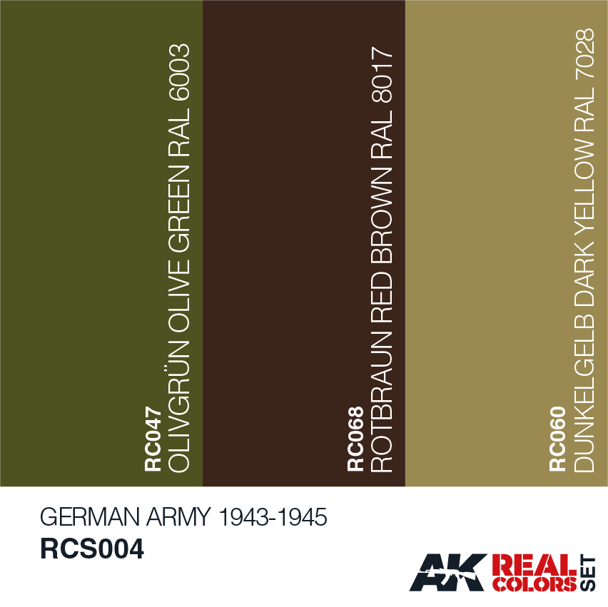 AK Interactive - 3 camouflage colors for vehicles and other equipment used by the German army from the spring of 1943 until the end of WWII. Included are: ral 6003 olivgrun (olive green), ral 7028 dunkelgelb (dark yellow) and ral 8017 rotbraun (red brown)