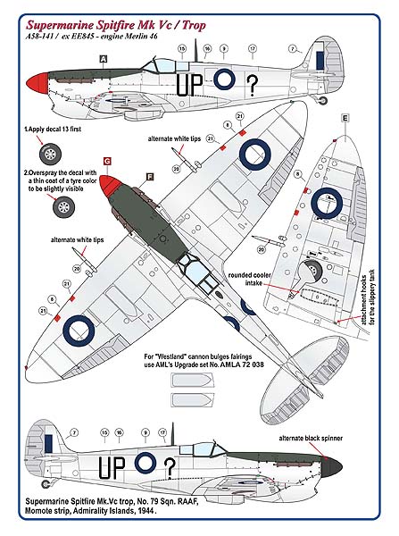 AML - 1/72 Supermarine Spitfire Mk.V / Trop 2 decal version: Spitfire MkVb trop, Robert Levine, 4th F.S., 52nd F.G., La Sebala, Tunisia, June 1943. Spitfire Mk.Vc trop, No.79 Sqn. RAAF, Momote strip, Admirality Islands, 1944.