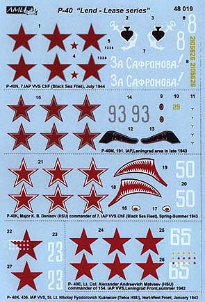 AML - 1/48 Lend-Lease Curtiss P-40s in Soviet Service 5 Curtiss P-40E Kittyhawk/Warhawk White 65 Co 154 Iap Leningrad 1942; P-40K. White 23 N>Kuznecov 436 Iap 1943; White 50 P-40K.Denisov Co 7 Iap Black Sea Fleet 1943; P-40N White 8 7 Iap Black Sea Fleet 1944; White 93 V>A>Ryevin 191 Iap Lenningrad 1943. Inc etched seatbelts