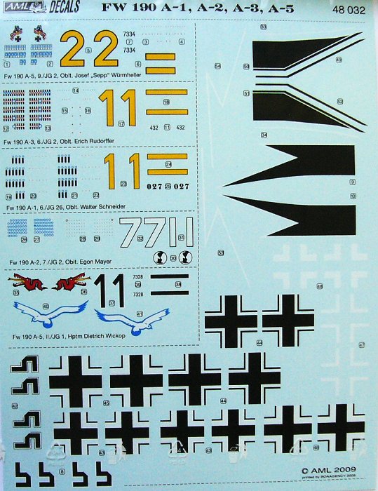 AML - 1/48 Focke-Wulf Fw-190A Luftwaffe Aces Pt 1 (5) Fw-190A-1 Yellow 1 Staffelcapitan 6/JG 26 Oblt Walter Schneider France 1941, Fw-190A-2 White 7 Staffelcapitan 7/JG 2 Oblt Egon Mayer 1942, Fw-190A-3 Yellow 1 6/JG 2 Oblt Erich Rudorffer 1942, Fw-190A-5 Black 1 Hptm Dietrich Wickop Gruppencommander II/JG 1 1943, Yellow 2 Staffelkapitan 9/JG 2 Oblt Josef Wurmheller
