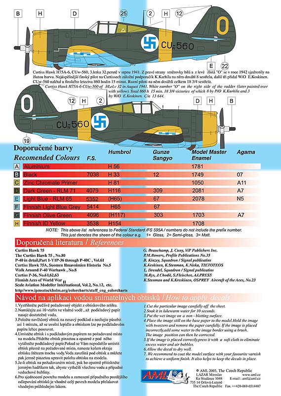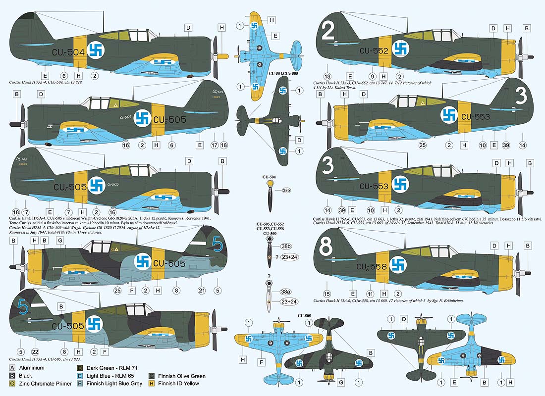 AML - 1/72 Finnish Curtiss-Hawk H-75 Hawks (over Karelian Sky 6) CU-504, CU-505/5, CU-552/2, CU-553/3, CU-558/8, CU-560/0 Olive green and olive green/dark green camouflage schemes with yellow trim