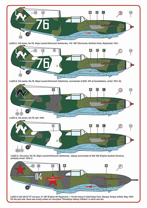 AML - 1/72 Lavochkin LaGG-3 Part 1. (3) Flown by Capt Mironov No 78 609th IAP; Capt Galchenko No 76 145th Iap with black or white cats on fin; 21st Iap No 04