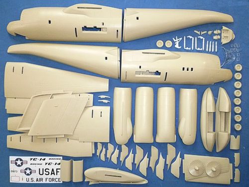 Anigrand Craftswork - 1/72 Boeing YC-14 Advanced medium Stol transport. In 1972, the U.S. Air Force issued the Advanced transport Stol transport program for a new medium airlifter that capable of operations into battle zones with short, temporary airfields. Two proposals were accepted for construction as the Boeing YC-14 and McDonnell-Douglas YC-15 prototypes. The Boeing design for Stol performance was based on the use of a supercritical wing, developed by Nasa that the high-speed airflow from the engines tended to cling to the upper surface of the wing/flap system and was thus directed downward to provide powered lift. It was the most efficient powered-lift system ever developed. The first flight of the YC-14 demonstrated superior Stol performance and low-speed maneuverability. However, by the time the YC-14 was ready for production, military priorities had changed. The Air Force decided it needed a larger transport that would fly to standard, conventional airfields rather than into battle zones. In 1979, the Air Force formally cancelled the Amst program for both the YC-14 and the YC-15. As a result, the C-X program, the C-17 evolved.