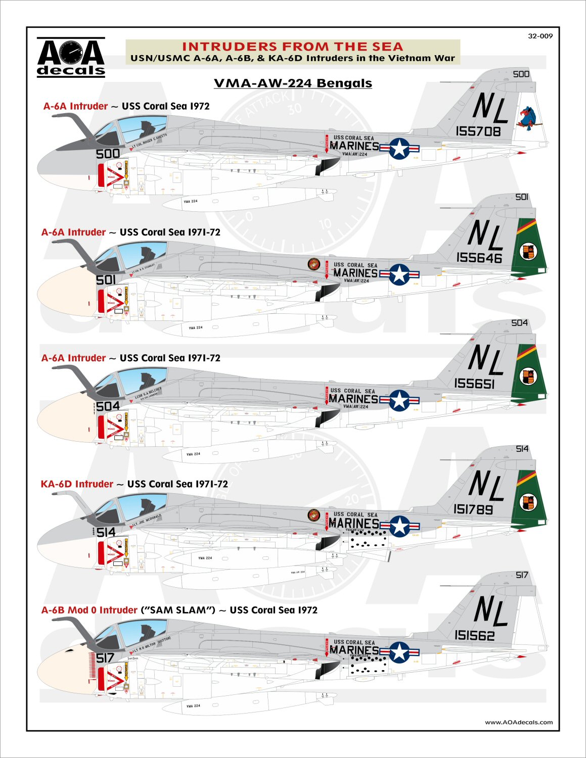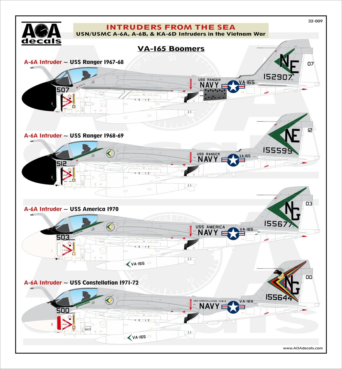 AOA Decals - 1/32 Intruders from the sea. USN/USMC Grumman A-6A, A-6B, & KA-6D Intruders in the Vietnam War. This extensive decal sheet provides the option for up to 16 schemes covering four squadrons. Two of which, VA-165 and VA-196, were tied for the most A-6 Intruder Vietnam combat cruises (5 each). Another is the last of the four USMC A-6 squadrons in Vietnam, VMA-AW-224 (the other three USMC squadrons were covered in the first AOAdecals release INTRUDERS FROM THE BEACH, sheet 32-001). And lastly, the final squadron covered is VA-95, which supported the naval mine clearing Operation End Sweep along the North Vietnamese coast under the Paris Peace Accords. 16 Marking Options Included: VMA(AW)-224 Bengals - 5 options: USS Coral Sea 1971-72 (3x A-6A including CAG scheme, 1x A-6B, & 1x KA-6D) VA-95 Green Lizards - 2 options: USS Coral Sea 1973 (2x A-6A, including CAG scheme) VA-165 Boomers - 4 options: USS Ranger 1967-68 (A-6A), USS Ranger 1968-69 (A-6A), USS America 1970 (A-6A), & USS Constellation 1971-72 (A-6A CAG scheme) VA-196 Main Battery - 5 options: USS Constellation 1968-69 (A-6A), USS Ranger 1969-70 (A-6A), USS Enterprise 1971-72 (1x A-6A & x1 A-6B), USS Enterprise 1972-73 (KA-6D) Accurate stencils provided for one aircraft, however, the stencils provided are complete airframe stencils. The stencil sheet is also available to purchase separately, see 32-002. Decals also included for MERs and fuel tanks.