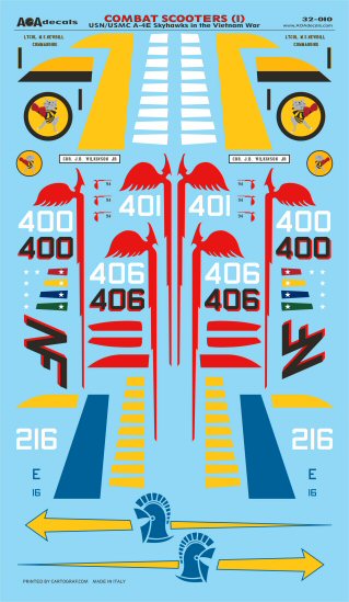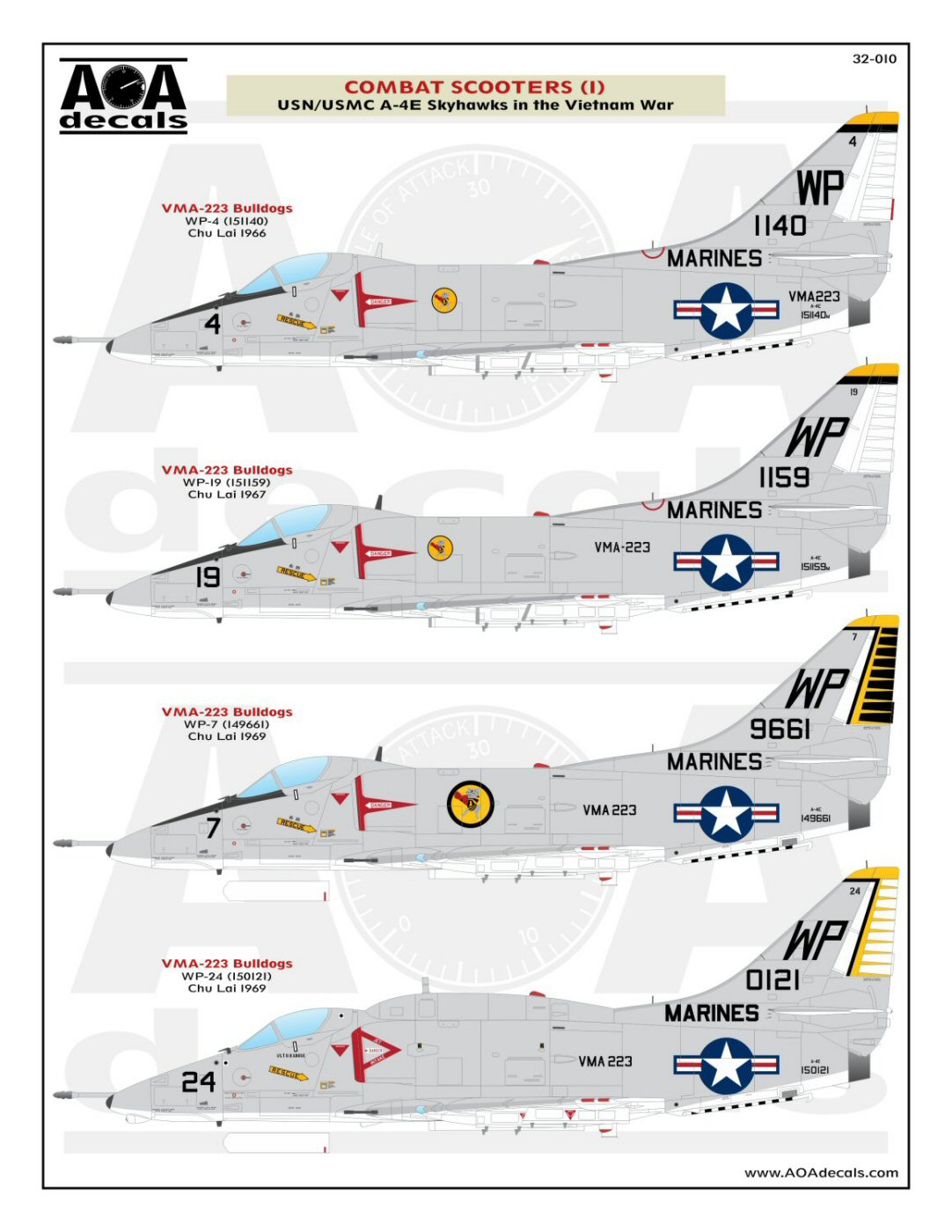 AOA Decals - 1/32 Combat Scooters (1) - USN/USMC Douglas A-4E Skyhawks in the Vietnam War. This Part 1 decal sheet focuses on three A-4E Skyhawk squadrons in the Vietnam War. Typical for AOA's coverage of Vietnam USN/USMC aircraft, this sheet also provides the modeler with the choice of time periods for a specific squadron, and in the case of the A-4, also a choice of aircraft with and without the later avionics hump. An exception unfortunately is VA-106, with only their second/final Vietnam cruise included (their first was the ill-fated USS Forrestal 1967 cruise). The Trumpeter A-4F kit includes VA-94 decals of the CAG's "BOBBIE" aircraft from the 1970 USS Bon Homme Richard cruise and incorrectly identifies the aircraft as an A-4F when it was actually an A-4E. Since the kit decals are also very inaccurate (size, shape, colors, etc), the same scheme is provided on this AOA sheet that much more closely represent the actual markings carried. The same CAG aircraft can also be represented with this sheet when it wore somewhat different markings from the previous 1969 cruise. The VMA-223 fuselage bulldog insignia is nearly always shown in illustrations and in previous decals with significant black outlining and details, presumably due to basing the appearance on more modern VMA-223 examples and/or squadron patch detail. However, the original sprayed on Vietnam-era period bulldog marking was much more basic than this! The bulldog decal insignia provided on this sheet was based on the actual Vietnam marking, and as such, is significantly closer in appearance to the original. 10 Marking Options Included: VMA-223 Bulldogs - 5 options from Chu Lai, South Vietnam, spanning betwen 1966-69 VA-94 Mighty Shrikes - 4 options: 1 from USS Bon Homme Richard 1968, 1 from USS Bon Homme Richard 1969 (CAG scheme), and 2 from USS Bon Homme Richard 1970 (one CAG, one line scheme) VA-106 Gladiators - 1 option from USS Intrepid 1968-69 As usual with AOA releases, an extensive airframe stencil sheet is also included. Stencils are provided for one A-4, however, the stencil sheet is also available to purchase separately (see 32-012). Decals also included for VA-94 and VA-106 fuel tanks (VMA-223 generally had plain white fuel tanks without any squadron markings/identifiers.)