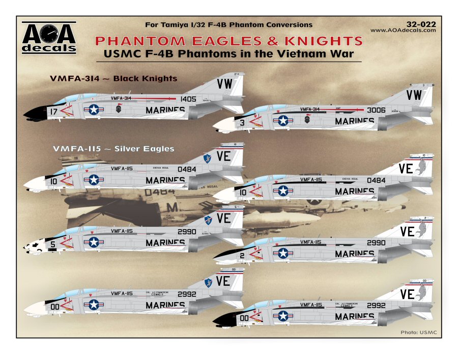 This limited 1/32 decal sheet is for F-4B Phantom conversions to the Tamiya F-4 Phantom series of kits and covers two USMC squadrons during the Vietnam War. Note that this release is for decals only - F-4B conversion parts are NOT included!
