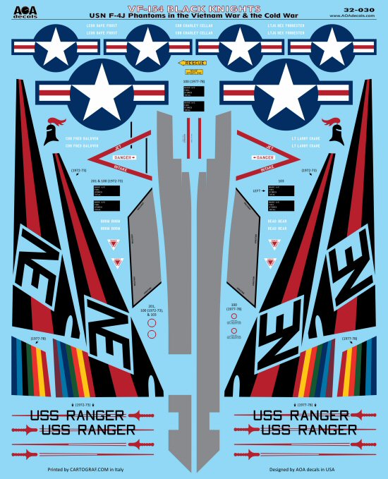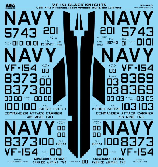 AOA Decals - 1/32 VF-154 Black Knights - USN McDonnell F-4J Phantoms in the Vietnam War & the Cold War. This sheet covers one Navy fighter squadron - VF-154 Black Knights - when they operated the F-4J Phantom in the 1970's.
