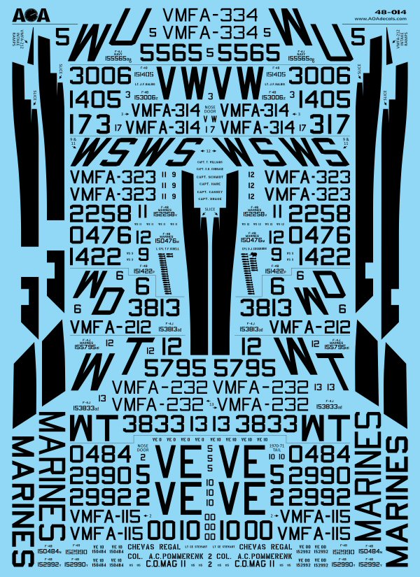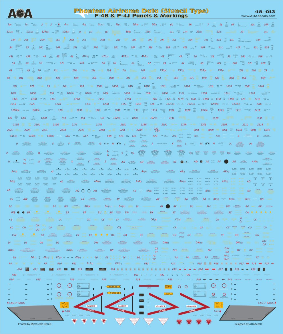 Full airframe data for one aircraft, including complete panel numbers/labels, is also included with this release. The same data sheet is also sold separately, see 48-013. Vast majority of the aircraft covered on this sheet had this type of airframe data that was typical of reworked airframes in mid/late 1960s into the early 1970s. Two primary exceptions are the early F-4J schemes of VMFA-232 and VMFA-334 which still carried the original factory new style of airframe data (not provided in this release).
