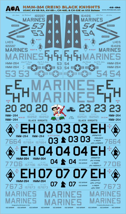 AOA Decals - 1/48 HMM-264 (Rein) Black Knights Usmc BAe V-8B NA, AV-8B+, Boeing CH-46E, & CH-53E on Uss Bataan. This 1/48 sheet covers multiple aircraft of the composite squadron from the 26th MEU, the reinforced HMM-264 Black Knights aboard the Uss Bataan (LHD-5) in 2006-2007.