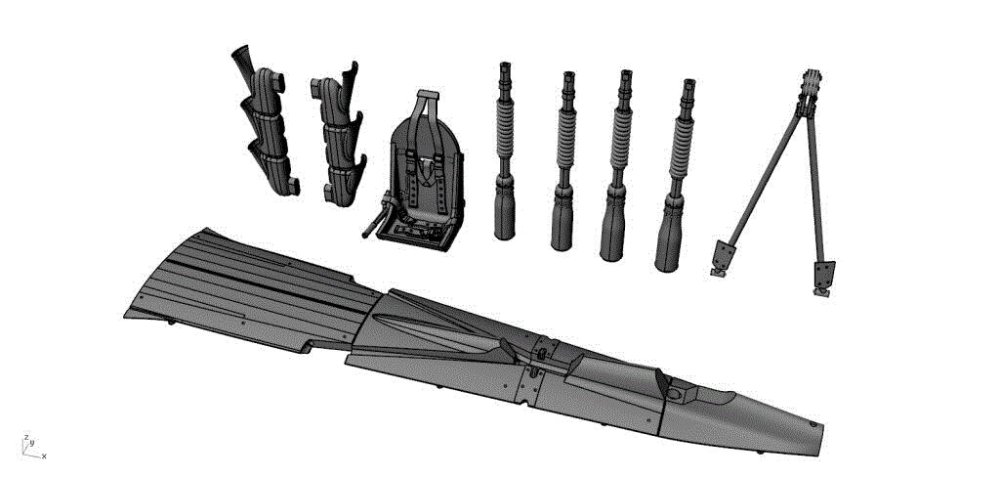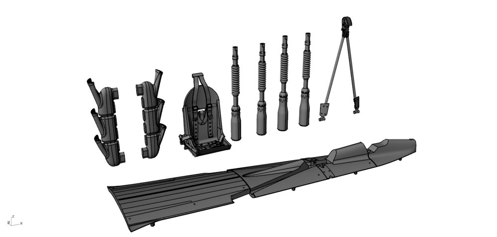 3D-Printed set with arrestor hook section, pilot's seat with harness, 20mm gun barrels and exhaust manifold.