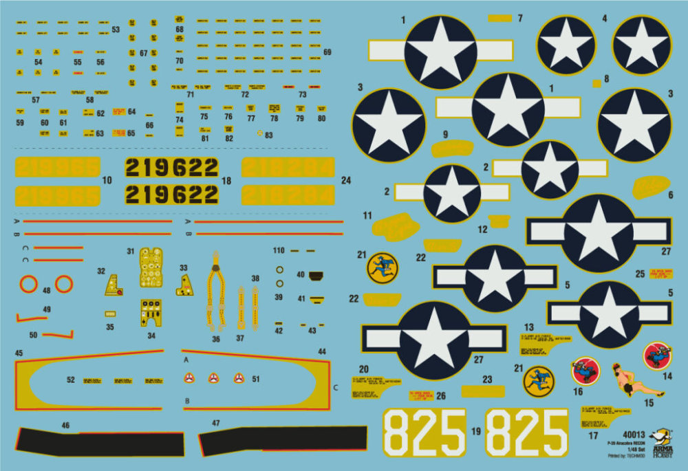 Arma Hobby - 1/48 Bell P-39 Airacobra Recon Contents: plastic / steel ball weight /(3D-Printed) cameras and template / mask / 3x decal by Techmod / link to 3D file with extra details for 3D print