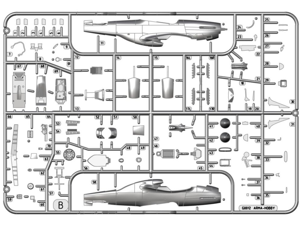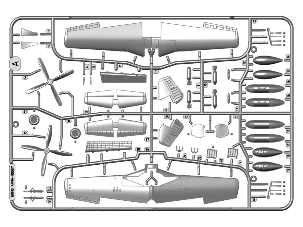 Arma Hobby - 1/72 North-American P-51D Mustang? Sprues with parts to build of most versions of the aircraft straight from the box.Decals with markings for three aircraft.Masks for the canopy and wheels.Produced under license from Boeing. Boeing, P-51 Mustang and the distinctive Boeing logos, product markings and trade dress are trademarks of The Boeing Company.