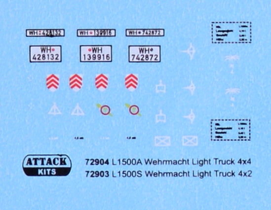 Attack Kits - 1/72 L1500S Wehrmacht Light Truck 4x2. L 1500 A was based on chassis of 1.5 ton truck. It was fitted with body to transport 7 people and was to act as an infantry transport. The vehicle was classified as Class 1500 vehicle same as Steyr 1500 A. From 1941 to 1943, some 4900 L 1500 Ainfantry transports were produced. L1500S Wehrmacht Light Truck 4x2 resin wheels (tyre and a disk), p/e fret includes details like (windscreen wiper, rear mirror, etc.)