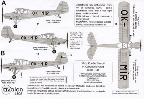 Planche Avalon au 1/48 pour le Fieseler K-65 Storch en service tchèque, compatible avec la maquette Tamiya Fi-156C.