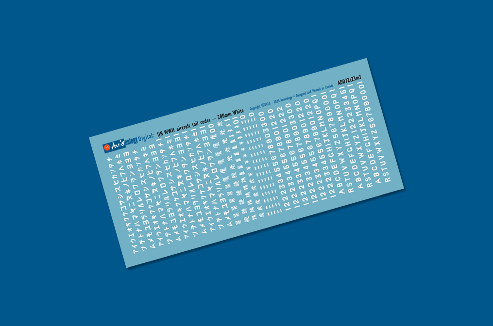 This new package provides at least 4 of each Japanese character, 4 of each Roman alphabet character, and 4 or more up to 10, especially for the '0' character of each numeral character, all with a nominal real-world height of 280 mm approximately 4 mm in 1/72 scale. Each glyph was initially hand-drawn before being manually traced using a digital stylus, in an effort to capture as closely as possible the hand-painted qualities of the original wartime codes.