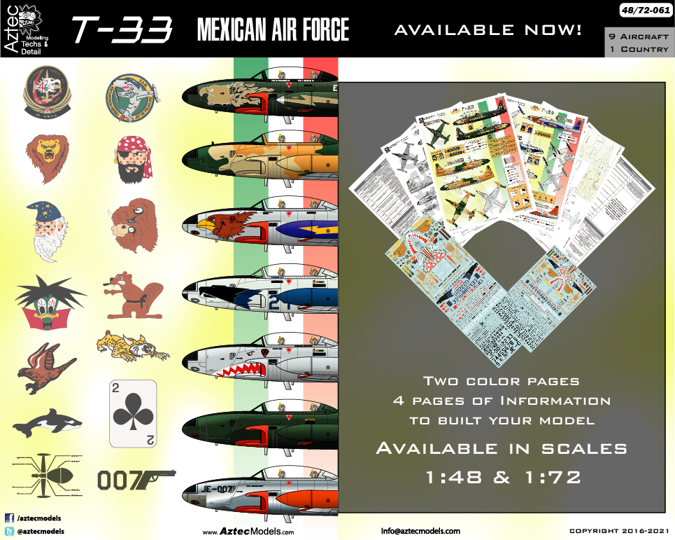 Planche de décalcomanies Aztec au 1/48 pour le biréacteur d'entraînement T-33 Shooting Star en service au Mexique.