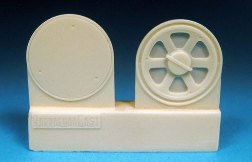 Barracuda Studios - 1/32 Republic P-47C/P-47D Thunderbolt Cross Tread Mainwheels. This set contains a pair of detailed resin mainwheels with crisply molded, seamless and accurate diamond tread pattern. You can choose between plain, covered or 6 slot hubs. The inner wheel hub detail is visible through the slots of the outer wheel hub, bringing a whole new level of detail. Makes a quick, easy and very visible upgrade. Designed to be used with Hasegawa, Trumpeter (whose wheels are just plain wrong) and Revell kits)