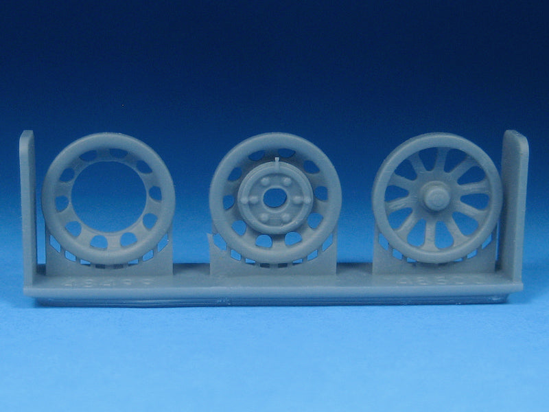This set contains a pair of accurate 3D-Printed mainwheels with diamond tread tires, complete with period accurate logo and tire data. The hubs are printed separately to preserve the see-through effect of the real wheel hub. Two rear hub styles are supplied, allowing these wheels to be fitted to P-51 kits from different manufacturers. Applicable for all P-51 variants. Prototype through P-51K. A big detail upgrade from kit wheels.