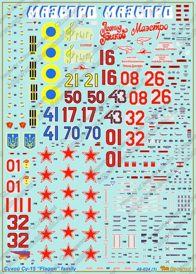 Begemot - 1/48 Sukhoi Su-15 Flagon (14) wide choice of aircraft in Russian and Ukraine service most in natural metal finish with two in brown/green/lt blue camouflage Includes stencil data.