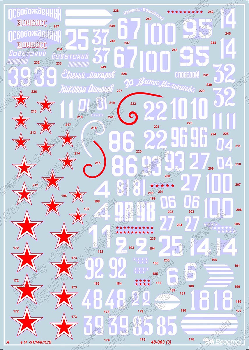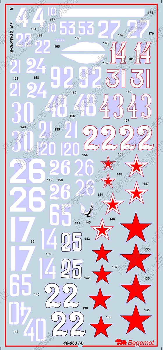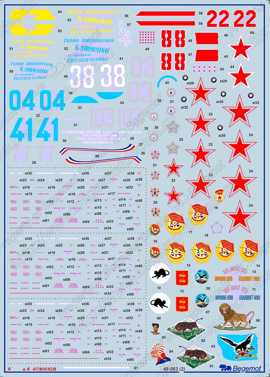 84 marking variations of Yak-9T Yak-9, Yak-9M, Yak-9K, Yak-9U, Yak-9V family aircraft's all types, from the Vvvs RKKAm including Normandy-Neman regiment.Including four big size decals and 13-pages instruction A3-size instruction.