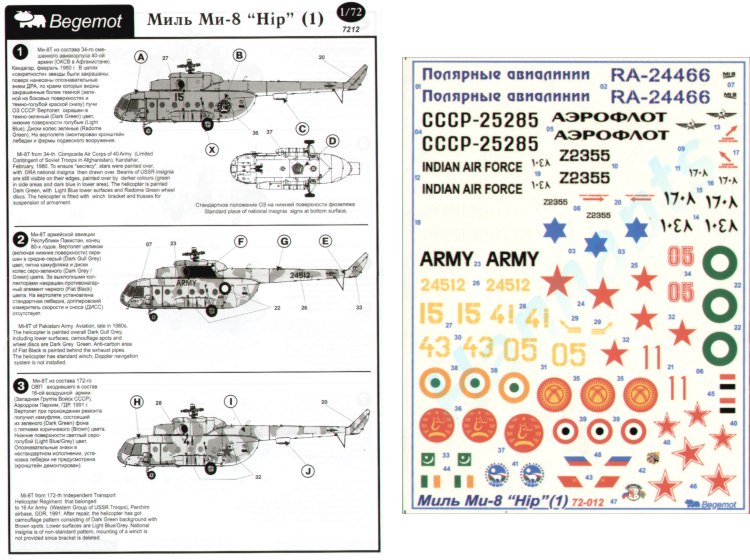Begemot - 1/72 Mil Mi-8 Hip (13) Soviet (5) in Afghanistan, Germany, Pakistan Army, Kyrgyzstan 2001, Egypt 1970, Egypt captured by Israel, Polar Airlines Russia 2004, Indian Air Force (2), Aeroflot,