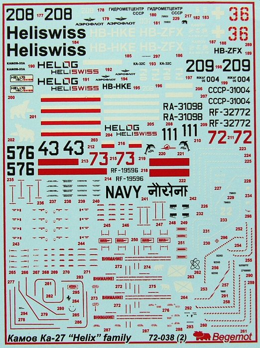 Begemot - 1/72 Kamov Ka-27 Helix family. Fantastic decal with markings for 62 different Ka-27, Ka-28 and Ka-29 in service with Russia, Soviet Navy, Ukraine, Indian Navy, Yugoslavia, China, Heliswiss Switzerland, Sth Korea etc., with stencil data and in a wide variety of camouflage schemes.