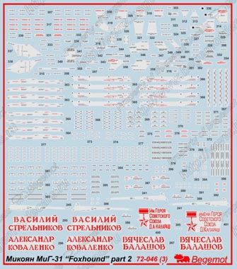 Begemot - 1/72 Mikoyan MiG-31 Foxhound. Consist from 2 big and 1 small decal sheets and approximately 50 versions of this aircraft.