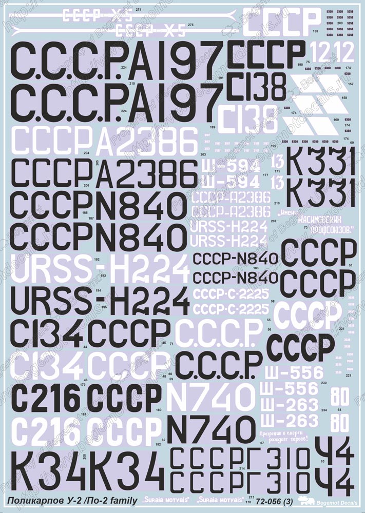 Begemot - 1/72 Polikarpov Po-2 family. Decal with opportunity make 79 marking variations of Po-2 family aircraft's all types, from next AF's: Civil Avviation fleet and Vvs RKKA, North Korea and Poland.