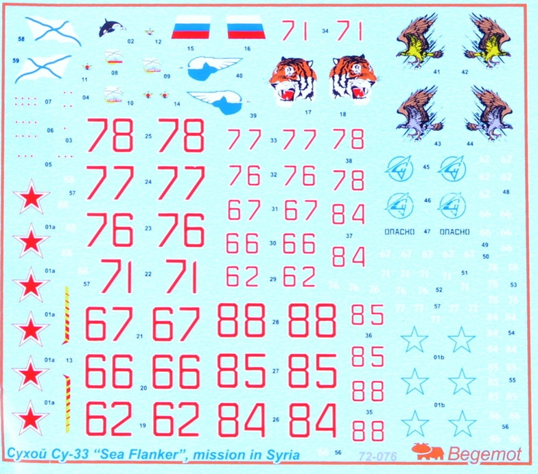 Begemot - 1/72 Sukhoi Su-33 in Syria. Su-33 from Soviet Naval Aviation in Syria. 10 markings scheme any Su-33s aircraft, which took a part in Admiral Kuznetsov carrier mission in Syria. In decal include insignias, board numbers, badges and mission marks.