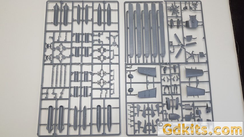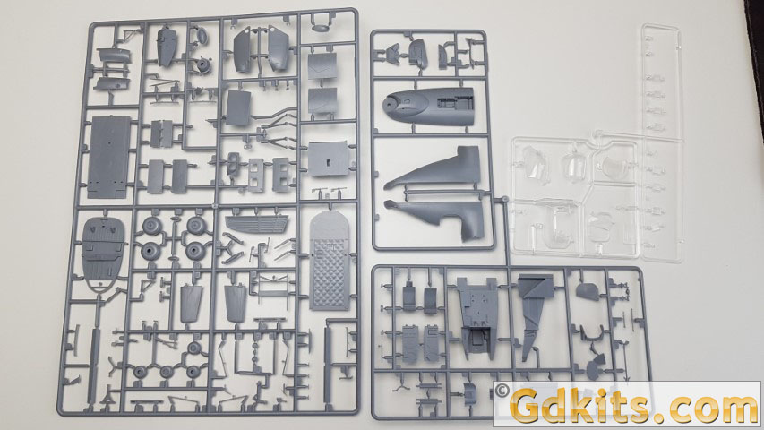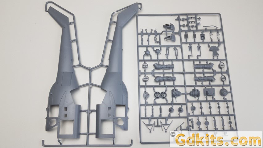 Les grappes sont d'un plastique gris clair classique. Le niveaux de détail est assez bon, avec des lignes de structure en creux trés fines, mais on peu regretter le manque flagrant de rivets, que ce soit en creux ou en relief, caractéristiques du Hind. Si les rivets en positif peuvent s'avérer problématiques pour le montage, car difficiles de les refaire si on les ponce, ceux en creux amènerait plus de richesse à la maquette finie. Rien de dramatique, mais pour un kit de 2021, on peut être quelque peu déçus.