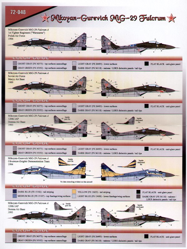 Cam Decals - 1/72 Mikoyan MiG-29 'Fulcrum' (5) Red 115 1st Fighter Regt. Polish Air Force 1994 with large badge on top of wing, Black 01 Soviet Air Force with shark mouth and wasp on tail 1989, White 45 and White 47 120th Iap Soviet Air Force 1993 with shark mouth, Ukranians Knights Demo Team. Lt and Dk blue/yellowith lt grey paint scheme