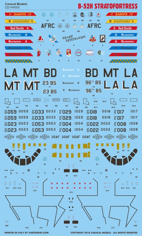 Caracal Models - 1/144 Boeing B-52H Stratofortress: High quality markings for recent/current USAF B-52H Stratofortresses, complete with enough stencilling and national insignia to build two examples. Designed to fit the Revell and Minicraft kits.