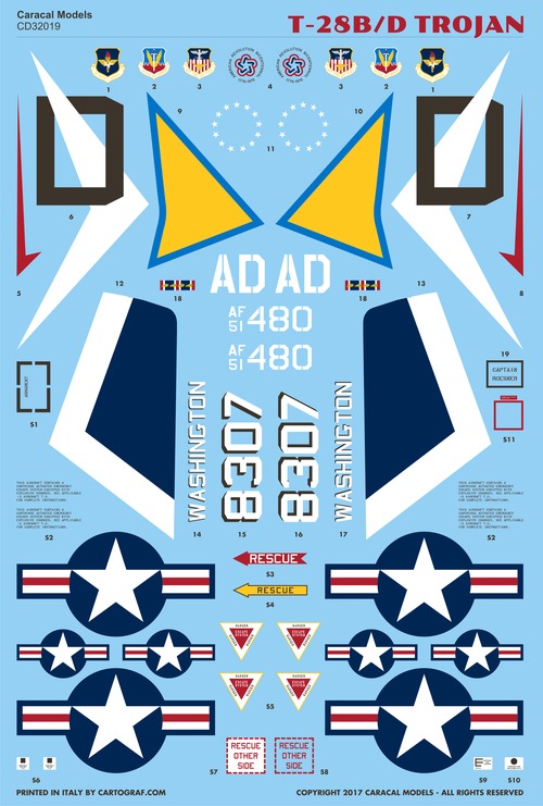Caracal Models - 1/32 North-American T-28B/D Trojan: Multiple US Navy T-28 options including a colorful Bicentennial scheme and two USAF examples. he T-28 Trojan has served both USAF and US Navy with distinction, and had been the main primary trainer of US Navy for more than three decades. With the release of our new sheet, you finally have multiple options for the Kitty Hawk kit that depict actual in-service aircraft (as opposed to the restored warbird options on the kit decal sheet).