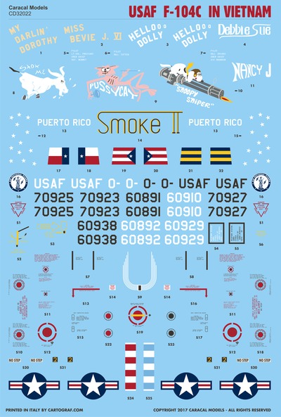 This new 1/32 scale sheet is dedicated to the Vietnam War service of Lockheed's famous missile with a man in it. This set features markings for the following camouflaged Starfighters: