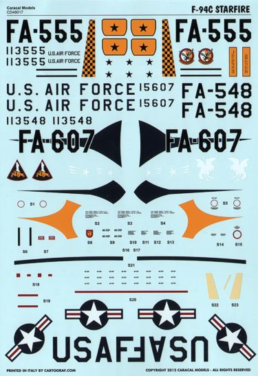Caracal Models - 1/48 F-94C Starfire (3) 51-13555/FA-555 27th FIS Griffiss AFB, NY 1855; 51-5607/F-607 354th FIS Oxnard AFB CA 1953; 51-13548/FA-548 29th FIS. designed to be used with the Kitty Hawk kit.