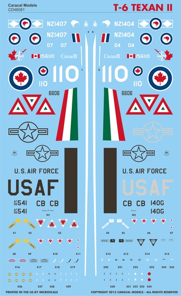 Caracal Models - 1/48 North-American T-6 Texan II / CT-156 Harvard II: New marking choices for the Ibex T-6 kit, featuring markings for Mexican Air Force and Royal New Zealand Air Force for the first time (in addition to Canadian and overall gray USAF aircraft) Already a very important platform in US/NATO fighter training, the versatile T-6 Texan II is rapidly becoming the trainer of choice for other countries as well. Our new decal sheet for the T-6 Texan II provides new markings for the Ibex kit. The options on this decal sheet are: CT-156 Harvard II, Royal Canadian Air Force - 2012 T-6C Texan II, Mexican Air Force - 2014 T-6C Texan II "NZ1404" (or "NZ1407"), Royal New Zealand Air Force - 2015 T-6 Texan II 98-541, USAF - Columbus AFB 2013