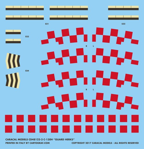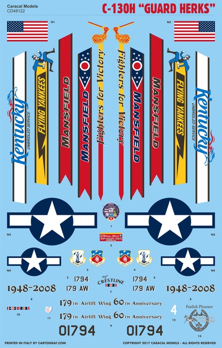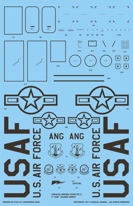 Caracal Models - 1/48 USAF Lockheed C-130H Hercules Guard Herks This very comprehensive 1/48 scale decal set features accurate markings for the hard-working C-130H fleet operated by the US Air National Guard.