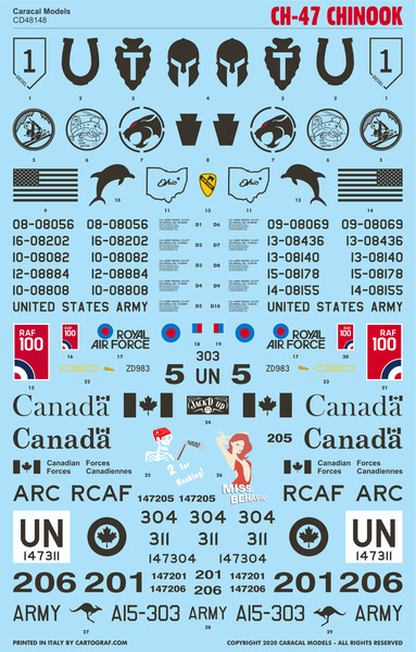 Caracal Models - 1/48 Boeing CH-47 Chinook Multiple international marking options for CH-47 Chinook helicopters. Another first for Caracal a brand new sheet for the CH-47, with many marking options for US, British, Australian and Canadian Chinooks.